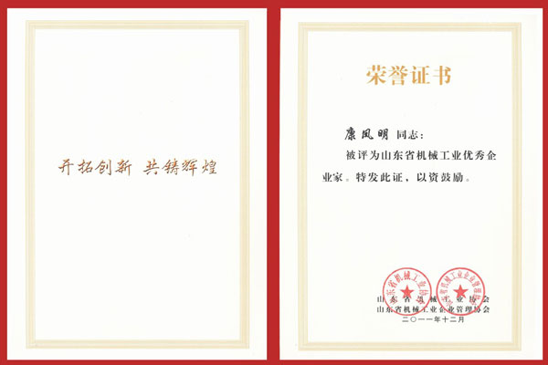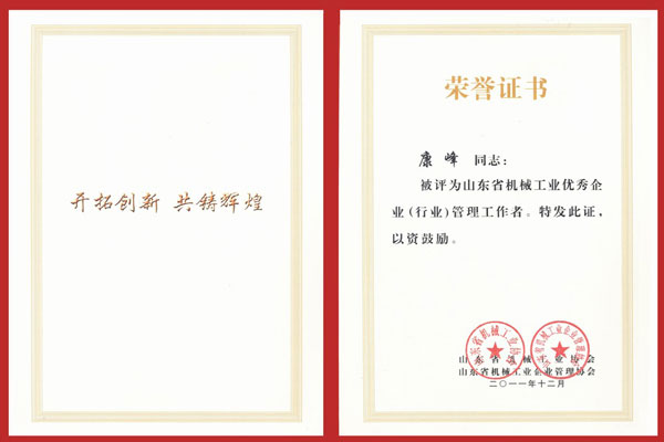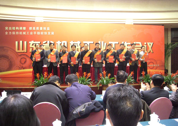 1月10日,山東省機械工業工作會議在(zài)泰安市東尊華(huá)美達酒店隆(lóng)重召開,中國機械工業聯合會特別顧問朱森第、山東省機械工業協會會長劉(liú)衛東、泰安市副市長閆新建等領導出席(xí)會議並頒獎。公司董事長、總經理康鳳明,常務副總經理(lǐ)潘(pān)憲平、副總經理康峰等領導參加會議。董事長、總經(jīng)理康鳳明榮獲“山東省機械工業優秀企業家”稱號,副總(zǒng)經(jīng)理朱洪臣榮獲“山東(dōng)省機(jī)械工業有突出貢獻科技專家”稱號,副總經理康峰榮獲(huò)“山東省機械工業(yè)優秀企業(yè)(行業)管理工作者”稱號。