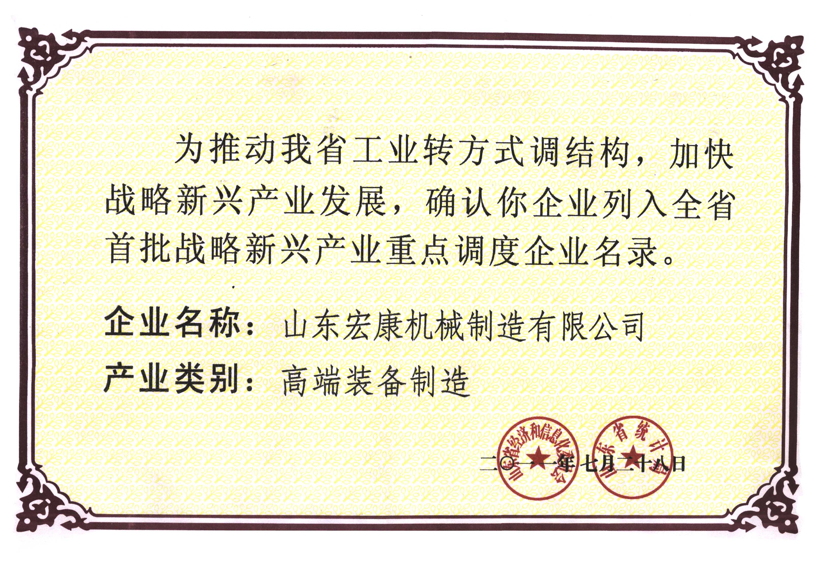 為認真貫徹落實省委、省政府關於“十(shí)二五”期間(jiān)加快發展(zhǎn)戰略新興(xìng)產業的重大(dà)決(jué)策部署,充分發揮(huī)戰略新興(xìng)產業重點企業的引(yǐn)領和帶動作用,推動我省工業轉方式、調結構,提(tí)高經濟運行質量和效益。經公(gōng)司申報,泰安市經信委(wěi)和統計局審(shěn)核推薦,省經信(xìn)委、省統計(jì)局聯合審核認定了全省254家首批戰略(luè)新興產業(yè)重點(diǎn)調度企業,其中高端裝備(bèi)製造企(qǐ)業33家,我(wǒ)公司名列(liè)其(qí)中。