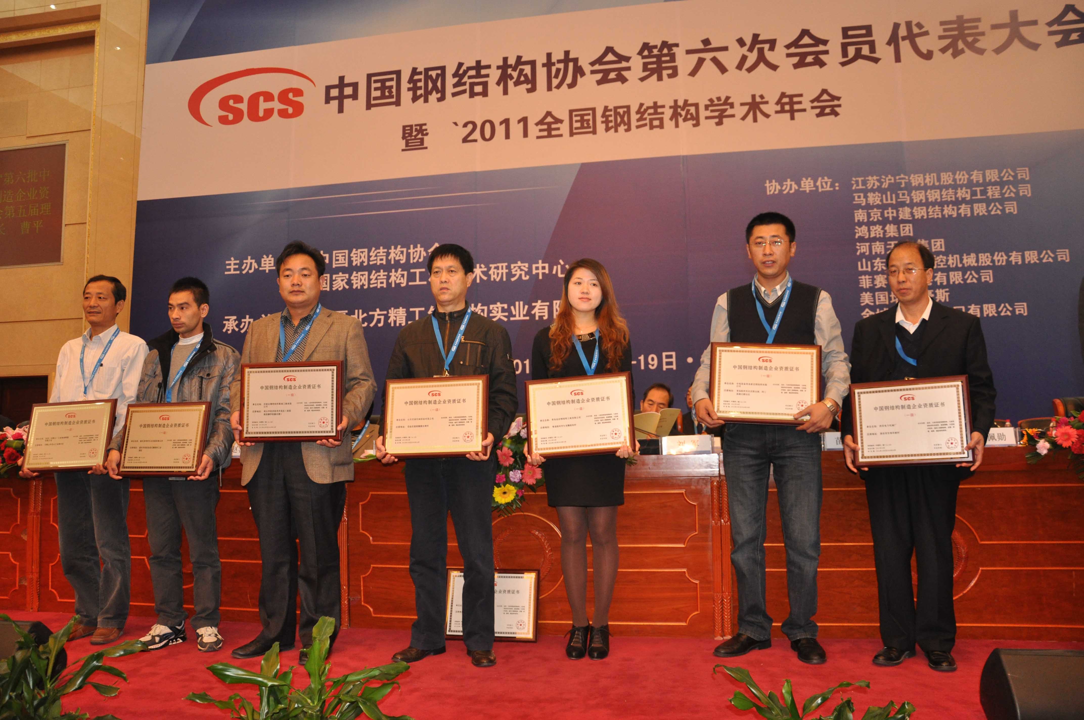 在大會上,公司董事長、總經理(lǐ)康鳳明當選為中國鋼結構協會第六屆理事會理(lǐ)事。同時,中國鋼結構協會向獲得第六批中國鋼結構製造企業資質的單位頒發了資質證書和牌匾。常(cháng)務(wù)副總經理潘憲平代表公司上台領取了中國鋼結構製造企業一級資質證書及牌匾。