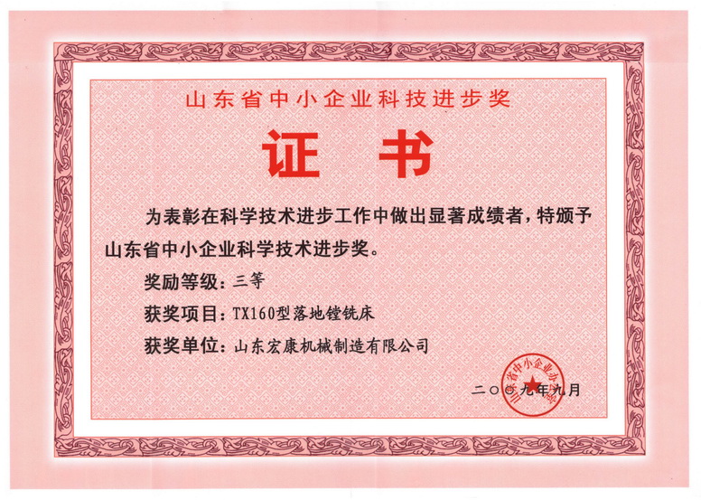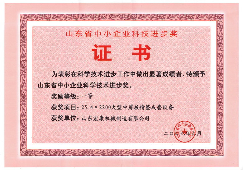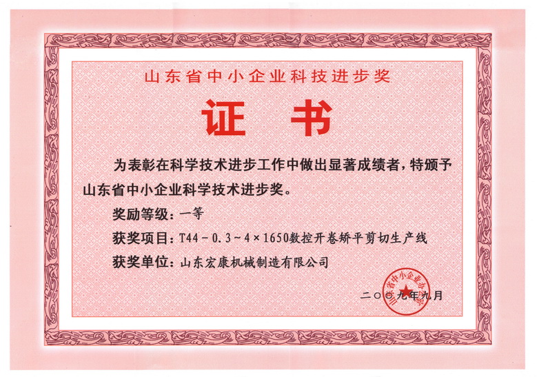 公司三(sān)項科技成果榮獲2009年山東省中小企業科(kē)技進步獎,其中“25.4×2200大型中厚板精整成套設備”和“T44-0.3~4×1650數(shù)控開卷矯平剪切生產線”兩個項目獲一等獎(jiǎng);“TX160型落地鏜(táng)銑床”項目獲(huò)三等獎。