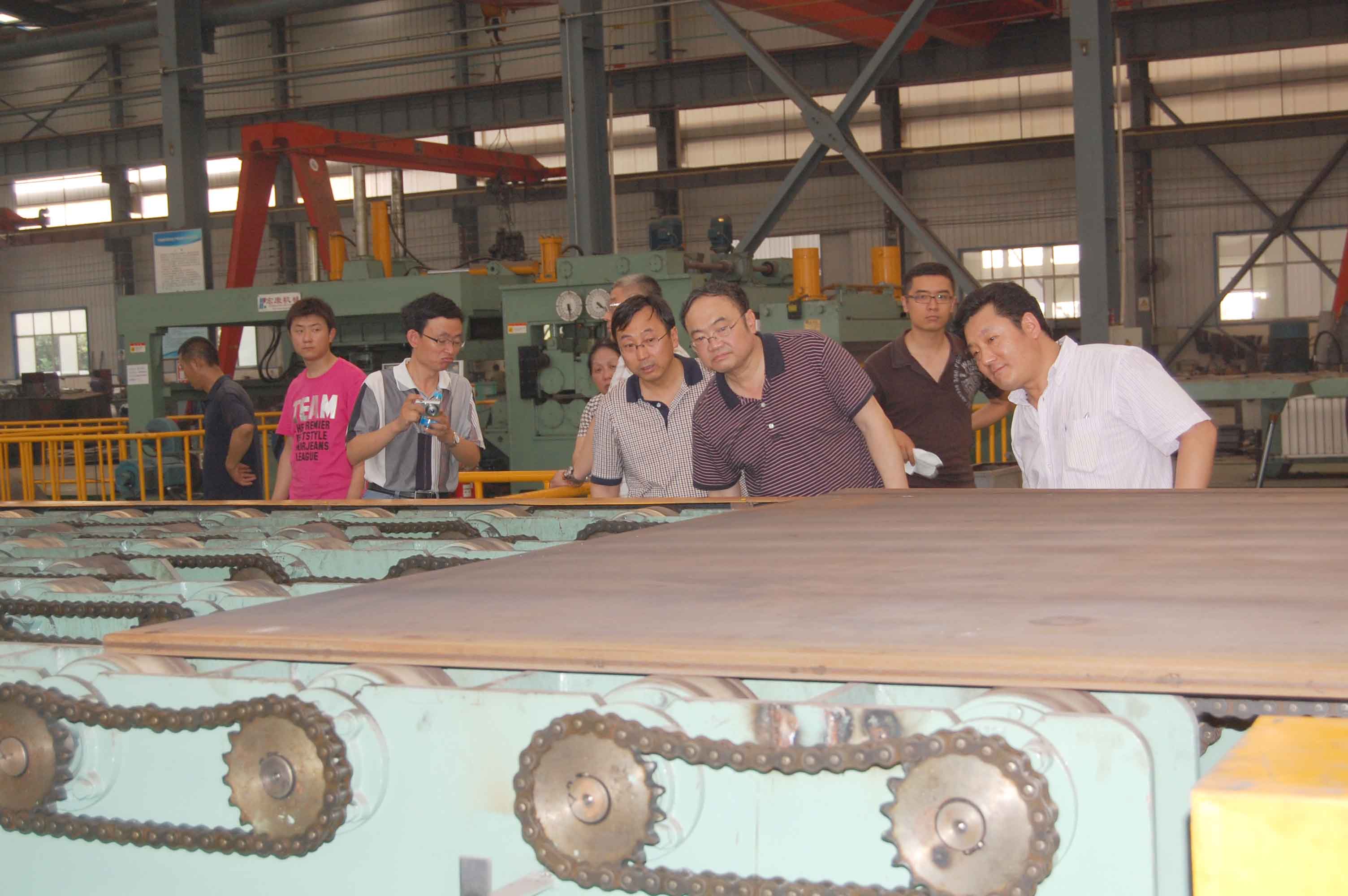 6月29日,首鋼京唐鋼鐵聯合公司領(lǐng)導組團來公司考察。圖為副總經(jīng)理朱洪軍陪同該公司銷(xiāo)售部常務副(fù)部(bù)長劉憲君在鋼鐵(tiě)物流公司考(kǎo)察(chá)T44-5~25.4×2200開卷矯平移動剪切生產線。